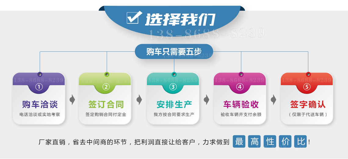• ①:購(gòu)車洽談:通過(guò)電話聯(lián)系發(fā)車型資料參數(shù)或?qū)嵉乜疾烨⒄勡囕v型號(hào)、價(jià)格和相關(guān)要求。