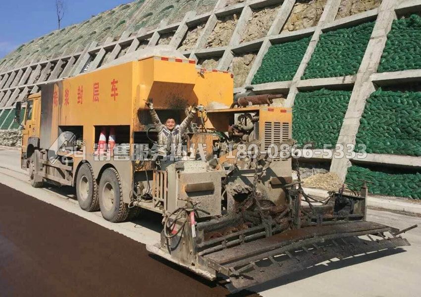 重汽后雙橋稀漿封層車又名微表處攤鋪機:向瀝青罐內(nèi)加入施工介質(zhì)(瀝青),向水罐內(nèi)加入施工用水,向助劑罐內(nèi)加入助劑,向填料箱內(nèi)加入填料(水泥),向料倉內(nèi)加入經(jīng)過級配的石料。啟動輔助發(fā)動機,帶動液壓動力系統(tǒng)工作,操作控制開關實現(xiàn)瀝青泵工作循環(huán)、水泵工作循環(huán)、拌合器工作,攤鋪箱調(diào)整完畢操作液壓控制裝置實現(xiàn)攤鋪箱工作。啟動總控開關,瀝青、水、骨料、填料、助劑將自動按照控制程序進入拌合器內(nèi),通過拌合器的快速強力攪拌形成稀漿混合料并送入攤鋪箱內(nèi),經(jīng)攤鋪箱的螺旋分料裝置將稀漿混合料均勻分布在攤鋪箱內(nèi),通過攤鋪箱將稀漿混合料攤鋪在路表面。停止控制開關,各系統(tǒng)將按照自動控制程序,結束工作。清洗各系統(tǒng)完成工作。