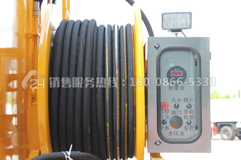 清洗部分:清洗罐采用5mm武鋼碳鋼制作,容積10.0方,帶視水管,安裝通潔/雙耀/品孚250L高壓清洗泵,壓力為20Mpa,流量:250L/min,帶100米清洗軟管,卷管力為1800N,膠管內(nèi)徑25mm,卷管速度0-25m/min,推進(jìn)力度大于180N。