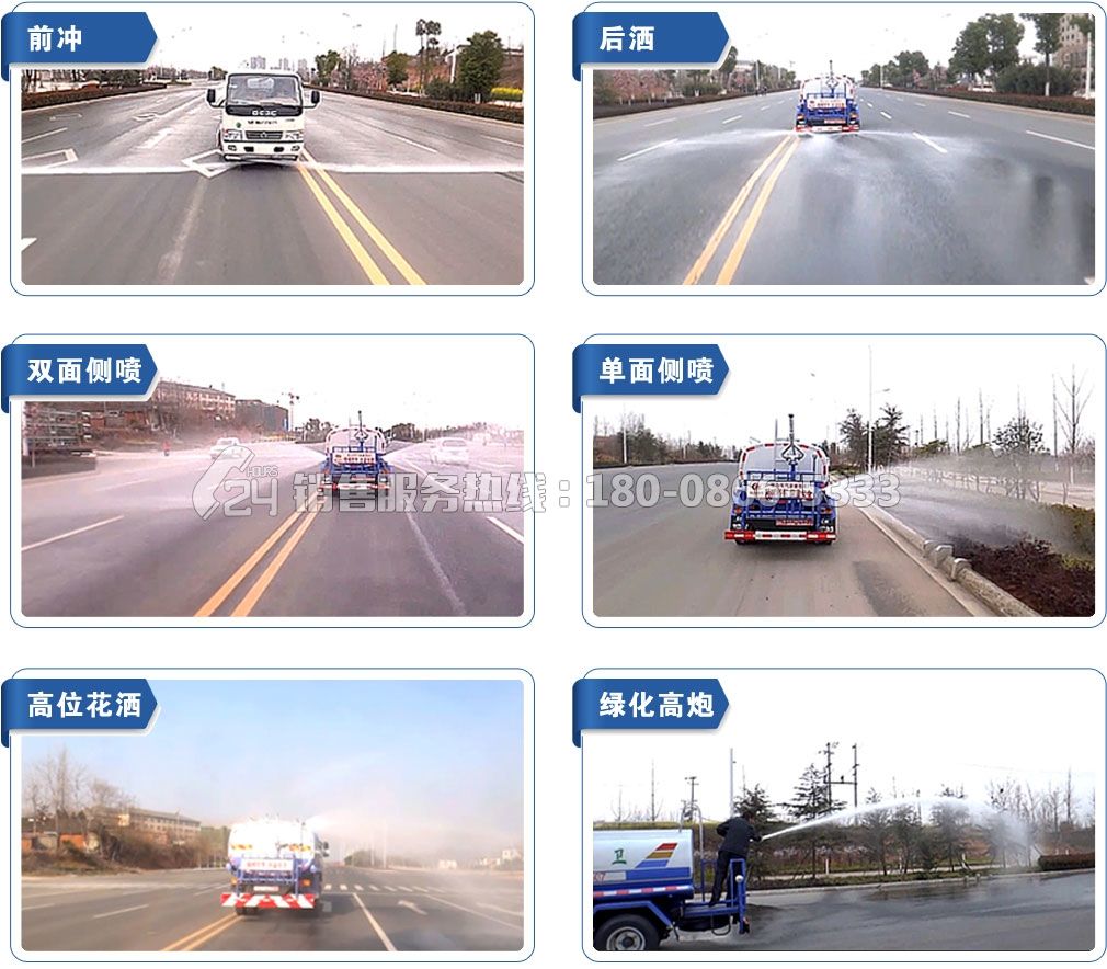 灑水車具有沖洗路面,澆灌園林,工地除塵,運(yùn)水、排水,應(yīng)急消防等功能。其標(biāo)配為前沖、后灑和側(cè)噴,采用自吸式專用水泵,泵可抽水排水,帶消防接頭、自流閥、罐體后帶工作平臺(tái),安裝綠化灑水炮,炮可旋轉(zhuǎn)可調(diào)節(jié)水量大小(噴射呈柱、霧、毛毛雨)。?可加裝30米到60米霧炮,加裝護(hù)欄清洗刷,除雪鏟,自動(dòng)電子水炮,打藥機(jī),保溫裝置等。