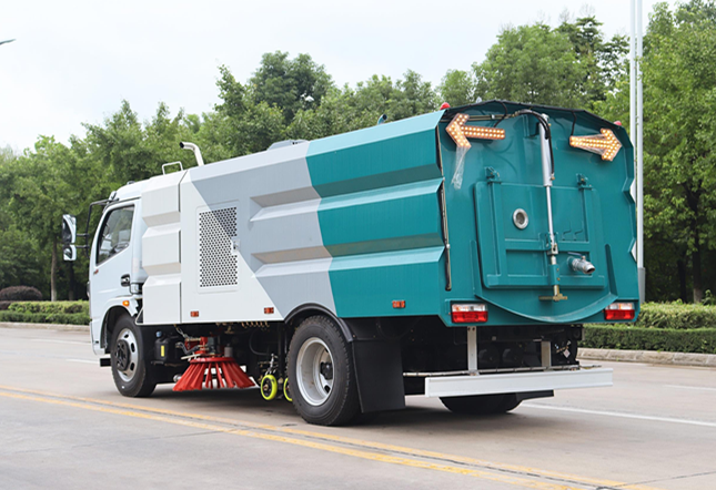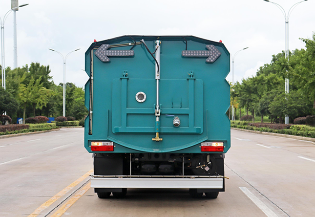 3、結構先進:清水箱充分利用了車載空間,容積大。垃圾箱采用傾翻卸料,帶高液位報警保護裝置和自潔裝置。作業(yè)中垃圾箱內污水液位達到規(guī)定高度時,保護系統(tǒng)會自動關停作業(yè)機構,可中途排水,排水后再作業(yè)直到垃圾箱裝滿垃圾。自潔裝置可在垃圾箱卸料時幫助卸料,清洗垃圾箱內部。左右立掃為單掃盤,減少了掃刷數(shù)量和掃刷消耗量,能降低使用成本。左右立掃分開控制,可實現(xiàn)左掃、右掃和全掃等不同作業(yè)模式。寬吸嘴能方便調整和保證吸嘴與路面間的合理間隙。吸嘴內高有噴水桿,盡可能多地將高壓洗滌噴嘴布置在吸嘴內部,不但清洗效果好,還能最大限度減少高壓水氣流沖起污物產生的二次污染。左右噴水桿安裝在吸嘴上,隨吸嘴升降,結構簡單緊湊,保證噴水桿的離地高度固定不變,達到最佳清洗效果。車子前端可加裝能左右上下擺動的高壓定點沖嘴,可對局部頑漬進行定點沖洗。開式液壓系統(tǒng)驅動左右立掃升降、左右掃肋旋轉、吸嘴升降、垃圾箱后門開閉、垃圾箱傾翻復位等機械動作。底盤變速箱側取力器驅動低壓水泵,實現(xiàn)灑水車的低壓沖洗功能。
