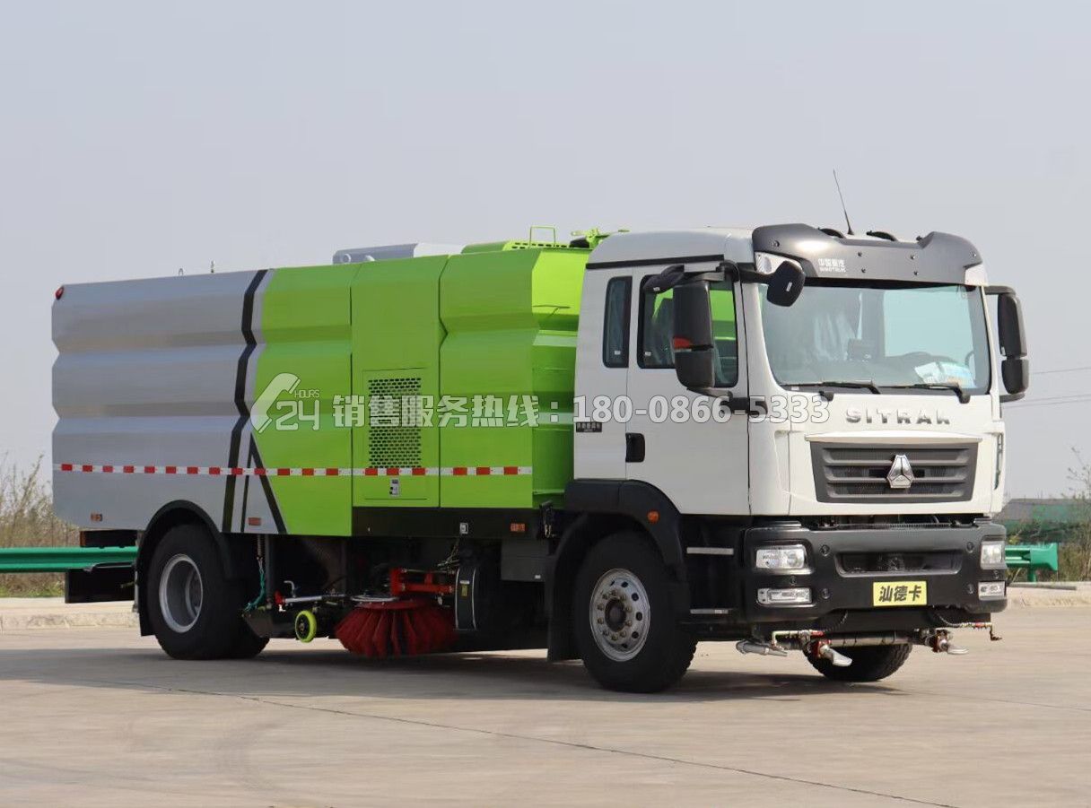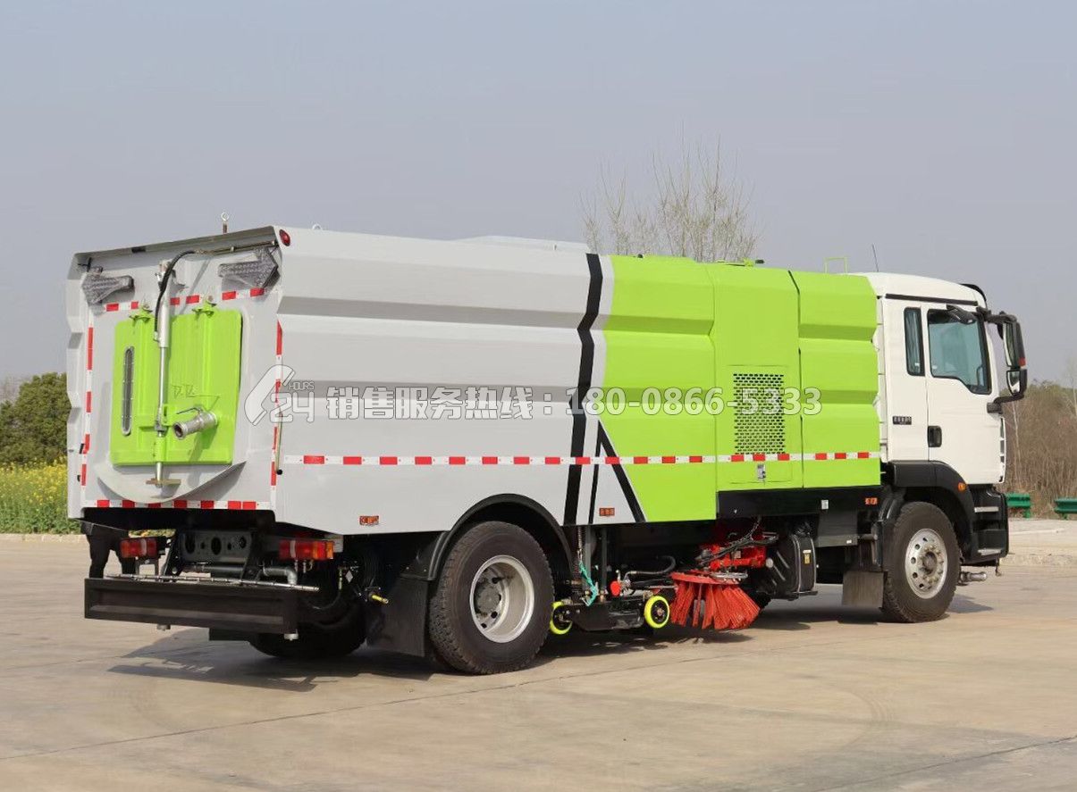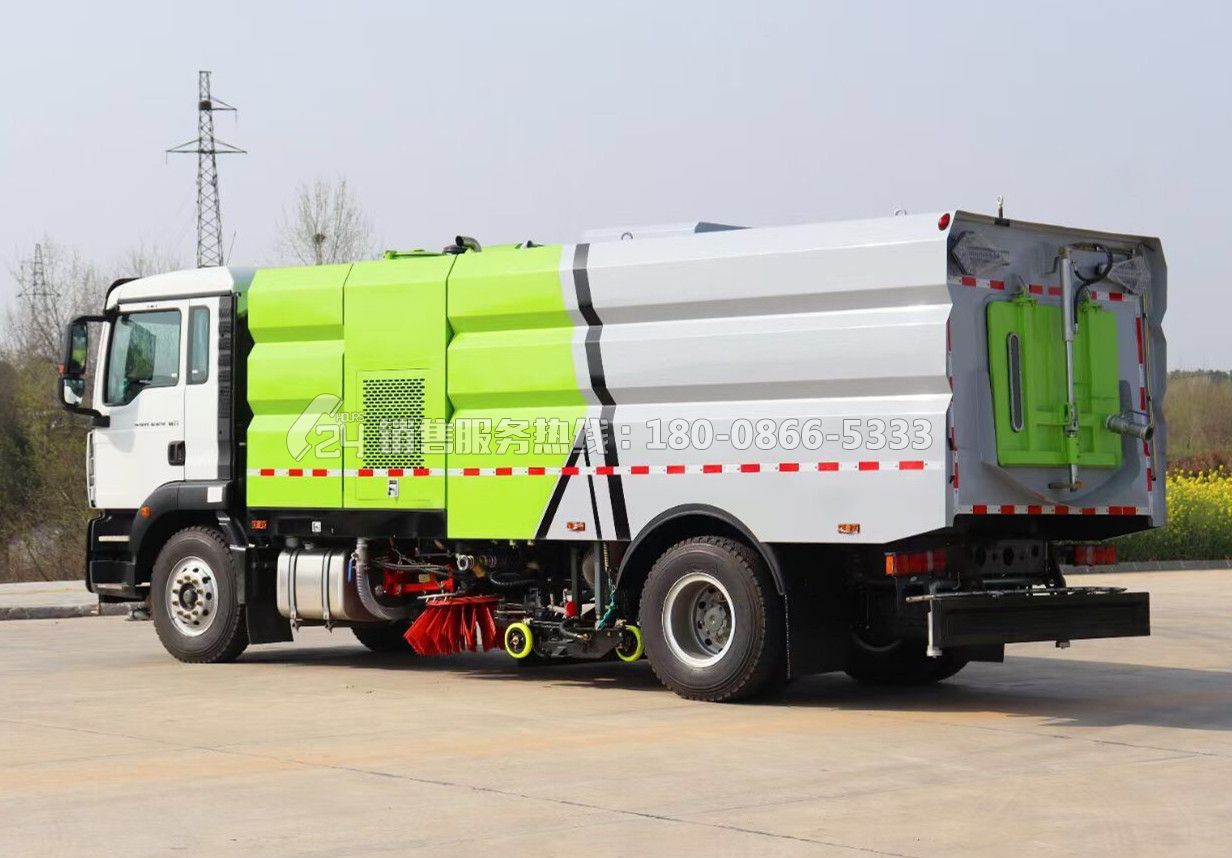 1、功能強(qiáng)大、一車多用:集掃路車、灑水車和高壓清洗車功能于一體的新型路面清洗設(shè)備,特別適用于清潔城市道路路面、路緣、路緣石。對(duì)路面的粉塵有著傳統(tǒng)掃路車、灑水車、高壓清洗車無法做到的清潔功能,能在一次作業(yè)中完成清掃、高壓清洗和垃圾、污水收集,而且具有高壓噴霧降塵功能。有“純洗”、“全洗掃”、 “左洗掃”、 “右洗掃”、 “全掃”、“左掃”、“右掃”7種作業(yè)模式可選擇。選擇“純洗”、“全洗掃”模式清洗廣場和路面,清洗效率高效果好,洗凈率達(dá)90%以上。選擇“左洗掃”或“右洗掃”模式清洗路面和路緣、洗刷路緣石立面。需要進(jìn)行路面清掃或路面保潔作業(yè)時(shí),可選擇掃路模式系統(tǒng)自動(dòng)開啟噴淋降塵進(jìn)行噴霧降塵作業(yè)??梢韵駷⑺囈粯訉?duì)路面進(jìn)行低壓沖洗作業(yè)。