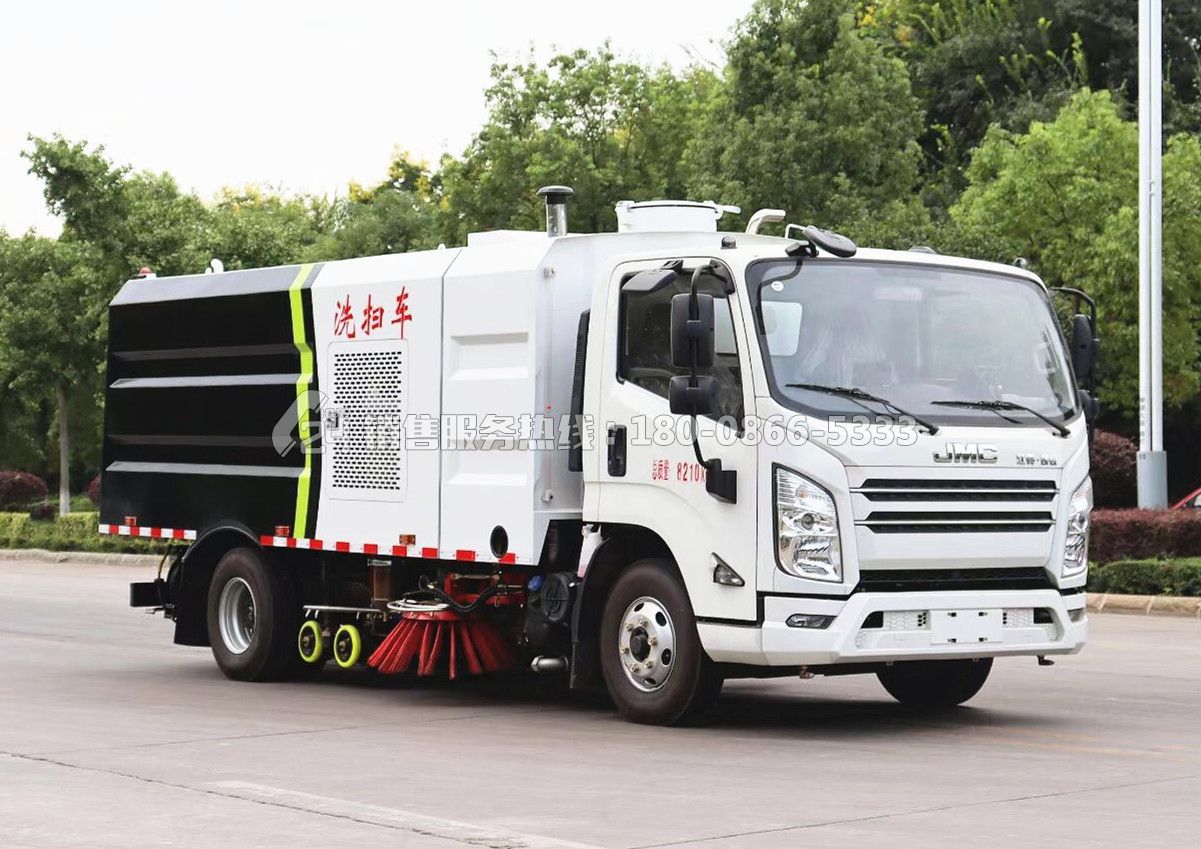 底盤通過加裝副發(fā)動機、風機、高壓水泵、清水箱、垃圾箱、左右立掃、帶噴水桿的寬吸嘴、低壓沖洗系統(tǒng)、掃盤降塵系統(tǒng)、液壓系統(tǒng)、專用裝置電控系統(tǒng)和副車架等改裝而成。