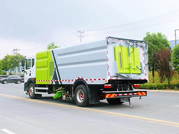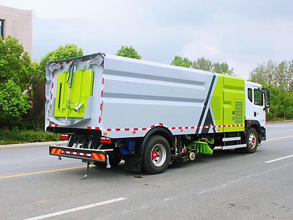 3、結(jié)構(gòu)先進(jìn):清水箱充分利用了車(chē)載空間,容積大。垃圾箱采用傾翻卸料,帶高液位報(bào)警保護(hù)裝置和自潔裝置。作業(yè)中垃圾箱內(nèi)污水液位達(dá)到規(guī)定高度時(shí),保護(hù)系統(tǒng)會(huì)自動(dòng)關(guān)停作業(yè)機(jī)構(gòu),可中途排水,排水后再作業(yè)直到垃圾箱裝滿(mǎn)垃圾。自潔裝置可在垃圾箱卸料時(shí)幫助卸料,清洗垃圾箱內(nèi)部。左右立掃為單掃盤(pán),減少了掃刷數(shù)量和掃刷消耗量,能降低使用成本。左右立掃分開(kāi)控制,可實(shí)現(xiàn)左掃、右掃和全掃等不同作業(yè)模式。寬吸嘴能方便調(diào)整和保證吸嘴與路面間的合理間隙。吸嘴內(nèi)高有噴水桿,盡可能多地將高壓洗滌噴嘴布置在吸嘴內(nèi)部,不但清洗效果好,還能最大限度減少高壓水氣流沖起污物產(chǎn)生的二次污染。左右噴水桿安裝在吸嘴上,隨吸嘴升降,結(jié)構(gòu)簡(jiǎn)單緊湊,保證噴水桿的離地高度固定不變,達(dá)到最佳清洗效果。車(chē)子前端可加裝能左右上下擺動(dòng)的高壓定點(diǎn)沖嘴,可對(duì)局部頑漬進(jìn)行定點(diǎn)沖洗。開(kāi)式液壓系統(tǒng)驅(qū)動(dòng)左右立掃升降、左右掃肋旋轉(zhuǎn)、吸嘴升降、垃圾箱后門(mén)開(kāi)閉、垃圾箱傾翻復(fù)位等機(jī)械動(dòng)作。底盤(pán)變速箱側(cè)取力器驅(qū)動(dòng)低壓水泵,實(shí)現(xiàn)灑水車(chē)的低壓沖洗功能。