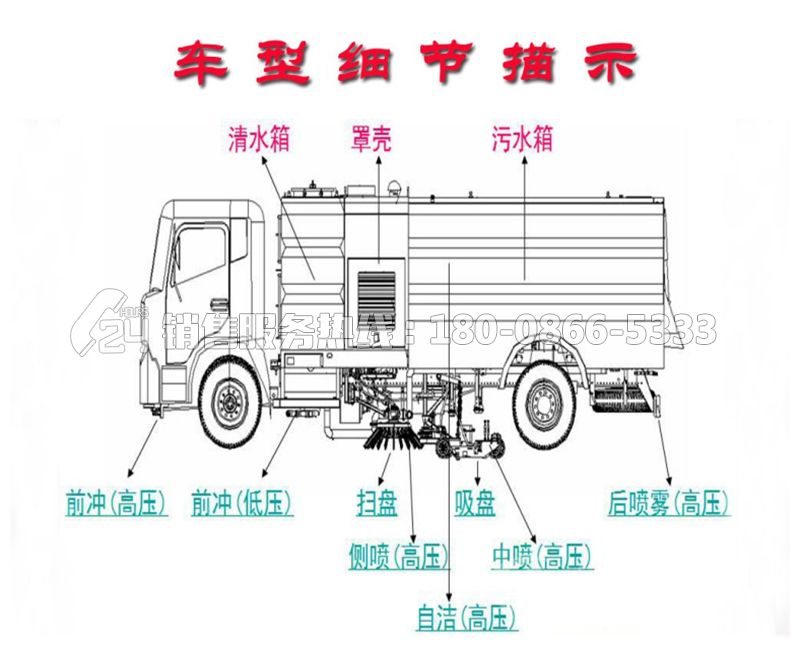 3、可選裝垃圾箱自潔功能、卷盤水槍、倒車影像作業(yè)監(jiān)控;