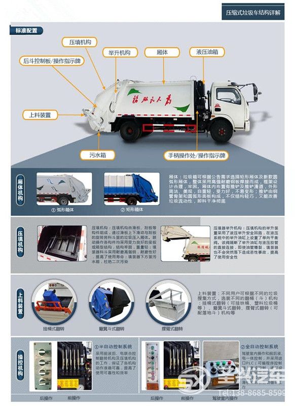 • 壓縮式垃圾車采用機(jī)電液一體化技術(shù),借助機(jī)、電、液聯(lián)合自動控制系統(tǒng),通過車廂、填裝器和推鏟等專用裝置,實(shí)現(xiàn)垃圾倒入、壓碎或壓扁、強(qiáng)力裝填,把垃圾擠入車廂并壓實(shí)和推卸。其主要特點(diǎn)是垃圾收集方式簡便、高效、具有自動反復(fù)壓縮以及蠕動壓縮功能,壓縮比高,裝載質(zhì)量大,作業(yè)自動化,動力性、環(huán)保性好,整車?yán)眯矢摺?/p>
