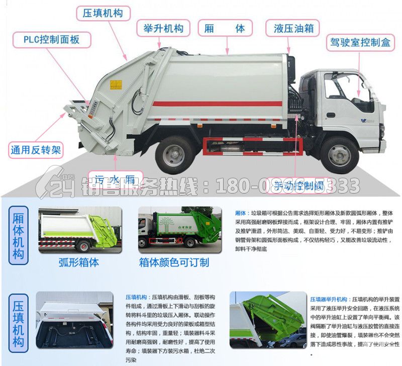 • 壓縮垃圾車:由密封式垃圾廂、液壓系統(tǒng)、操作系統(tǒng)組成。整車為全密封型,自行壓縮、自行傾倒、壓縮過程中的污水全部進(jìn)入污水廂,較為徹底的解決了垃圾運輸過程中的二次污染的問題,避免了給人們帶來不便,關(guān)鍵部件采用進(jìn)口部件,具有壓力大、密封性好、操作方便、安全等優(yōu)點??蛇x配后掛桶翻轉(zhuǎn)機(jī)構(gòu)或垃圾斗翻轉(zhuǎn)機(jī)構(gòu)。 選裝配置:翻轉(zhuǎn)斗、掛桶架、PLC自控 壓縮方式:雙向壓縮等