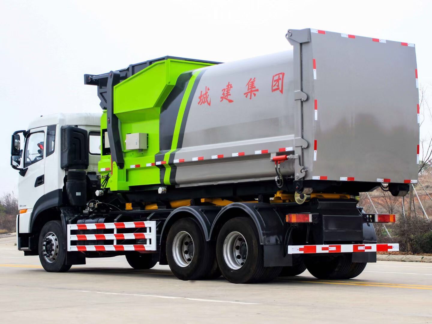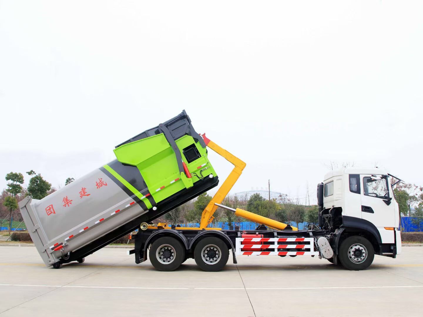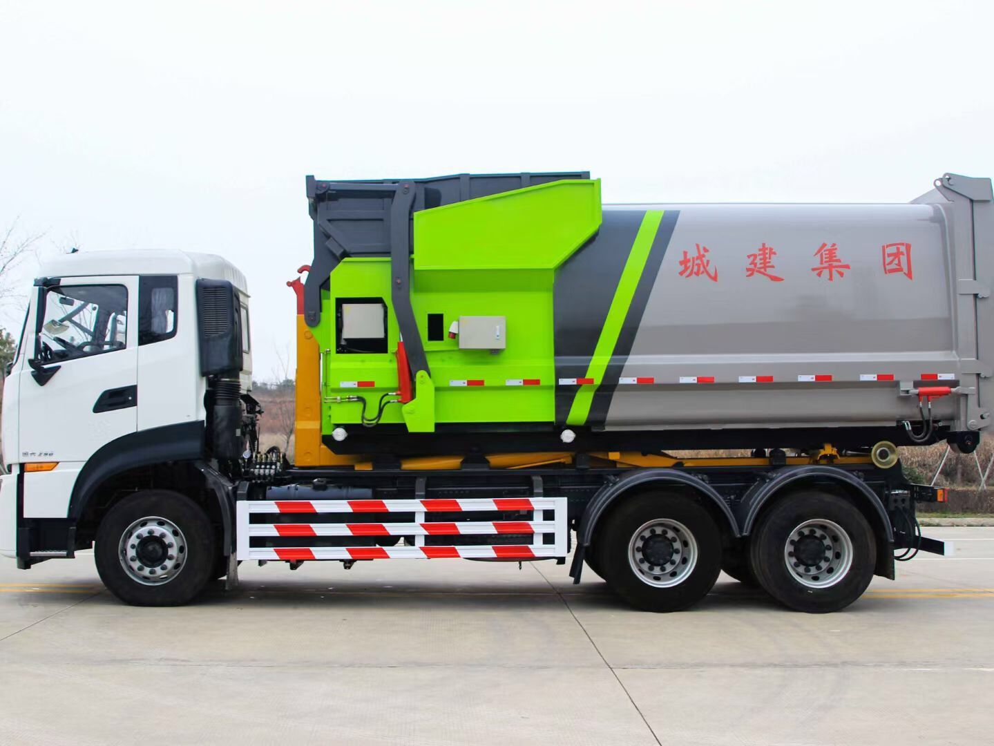 東風(fēng)天龍后雙橋鉤臂式垃圾車,標(biāo)配可配合14-18方垃圾箱使用,也可配合同級(jí)別移動(dòng)壓縮式垃圾箱使用,勾臂采用高強(qiáng)度優(yōu)質(zhì)錳鋼,副車架采用16號(hào)低合金槽鋼、20號(hào)方管與8mm、5mm、4mm、16Mn鋼板焊接而成,翻轉(zhuǎn)架與活動(dòng)勾臂垃圾車動(dòng)作設(shè)計(jì)合理可靠,實(shí)現(xiàn)拉箱、鎖緊、放箱和自卸操作簡(jiǎn)單方便,控制方式為駕駛室智能控制,也可根據(jù)用戶需要選裝駕駛室外傳統(tǒng)操作桿進(jìn)行控制。