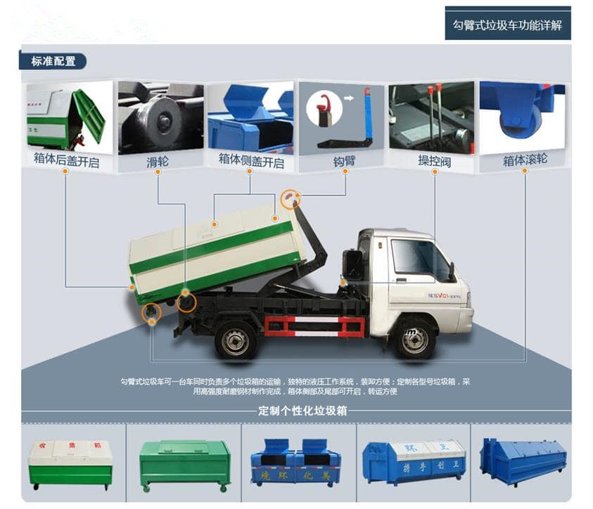 勾臂采用高強(qiáng)度優(yōu)質(zhì)錳鋼,由液壓系統(tǒng)、操作系統(tǒng)、拉臂,組成。舉升油制缸為國(guó)內(nèi)液壓件廠家生產(chǎn)的雙作用油缸,多路閥液壓控制,操作員手動(dòng)控制垃圾廂吊上放下,帶自卸功能,上下一次工作循環(huán)時(shí)間≤40S。標(biāo)配帶液壓油箱,滑輪,液壓多路閥,拉臂油缸,鎖緊油缸,液壓油過(guò)濾器,液壓油泵,液壓表等部件組成。選配可增配液壓支腿。