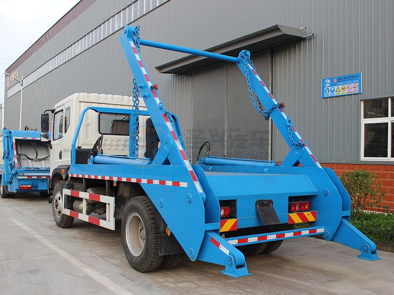 4.擺臂式垃圾車的料斗分密封、敞開兩種。先將垃圾裝進(jìn)料斗,后上吊鏈,然后操控?cái)[臂吊料斗上車。