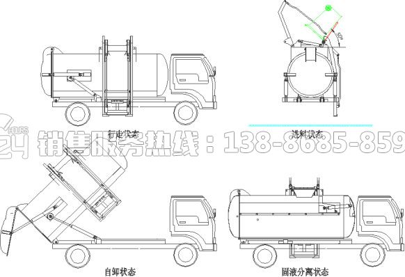3.罐體右側(cè)前部裝有掛桶提升機(jī)構(gòu)裝卸桶裝垃圾,掛桶提升機(jī)前側(cè)裝有圓形液位計。