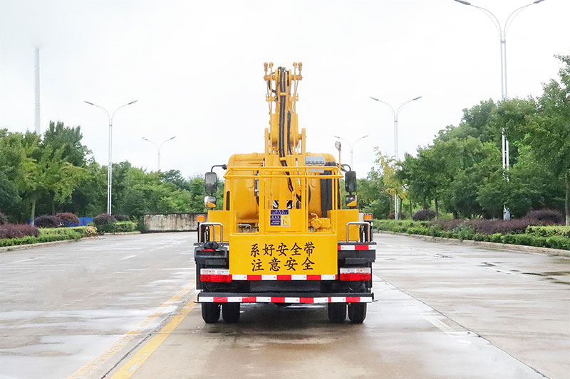 四個(gè)液壓伸展支腿,標(biāo)配0.8噸吊鉤,折疊式三節(jié)臂,360度全回轉(zhuǎn)旋平臺(tái),操作平臺(tái),工作斗均可操作。上裝部分采用國(guó)產(chǎn)換向閥及液壓油缸,換向平穩(wěn),操作靈活方便,液壓系統(tǒng)實(shí)現(xiàn)上下車互鎖,過(guò)載保護(hù),油缸安全自鎖,轉(zhuǎn)臺(tái)、工作斗雙工位操作,臂架結(jié)構(gòu)緊湊,機(jī)動(dòng)性好,作業(yè)范圍大,支腿與工作臂互鎖,安全可靠,防止誤操作,H型支腿,跨距大,穩(wěn)定性好,支腿即可獨(dú)立伸縮、又可聯(lián)動(dòng),裝有支腿報(bào)閃燈,用于作業(yè)時(shí)支腿示廊、發(fā)出光報(bào)警信號(hào),工作斗自動(dòng)調(diào)平,外置拉桿強(qiáng)制平衡。
