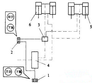 1.駕駛室啟閉缸控制按鈕;2.翻料缸控制按鈕;3.兩位三通電磁換向閥;4.電磁換向閥;5.翻料油缸;6.啟閉油缸