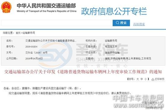 4月19日,交通運輸部印發(fā)《道路普通貨物運輸車輛網上年度審驗工作規(guī)范》(以下簡稱:《規(guī)范》),鼓勵道路貨物運輸經營者通過網上辦理普通貨運車輛年審。規(guī)范自2019年5月1日起施行,有效期為三年。