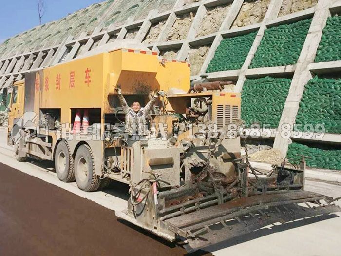 向?yàn)r青罐內(nèi)加入施工介質(zhì)(瀝青),向水罐內(nèi)加入施工用水,向助劑罐內(nèi)加入助劑,向填料箱內(nèi)加入填料(水泥),向料倉內(nèi)加入經(jīng)過級配的石料。啟動輔助發(fā)動機(jī),帶動液壓動力系統(tǒng)工作,操作控制開關(guān)實(shí)現(xiàn)瀝青泵工作循環(huán)、水泵工作循環(huán)、拌合器工作,攤鋪箱調(diào)整完畢操作液壓控制裝置實(shí)現(xiàn)攤鋪箱工作。啟動總控開關(guān),瀝青、水、骨料、填料、助劑將自動按照控制程序進(jìn)入拌合器內(nèi),通過拌合器的快速強(qiáng)力攪拌形成稀漿混合料并送入攤鋪箱內(nèi),經(jīng)攤鋪箱的螺旋分料裝置將稀漿混合料均勻分布在攤鋪箱內(nèi),通過攤鋪箱將稀漿混合料攤鋪在路表面。停止控制開關(guān),各系統(tǒng)將按照自動控制程序,結(jié)束工作。清洗各系統(tǒng)完成工作。