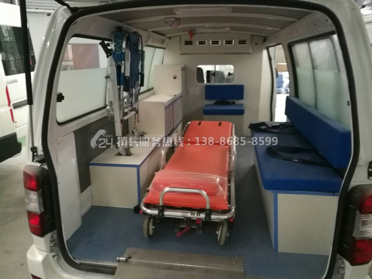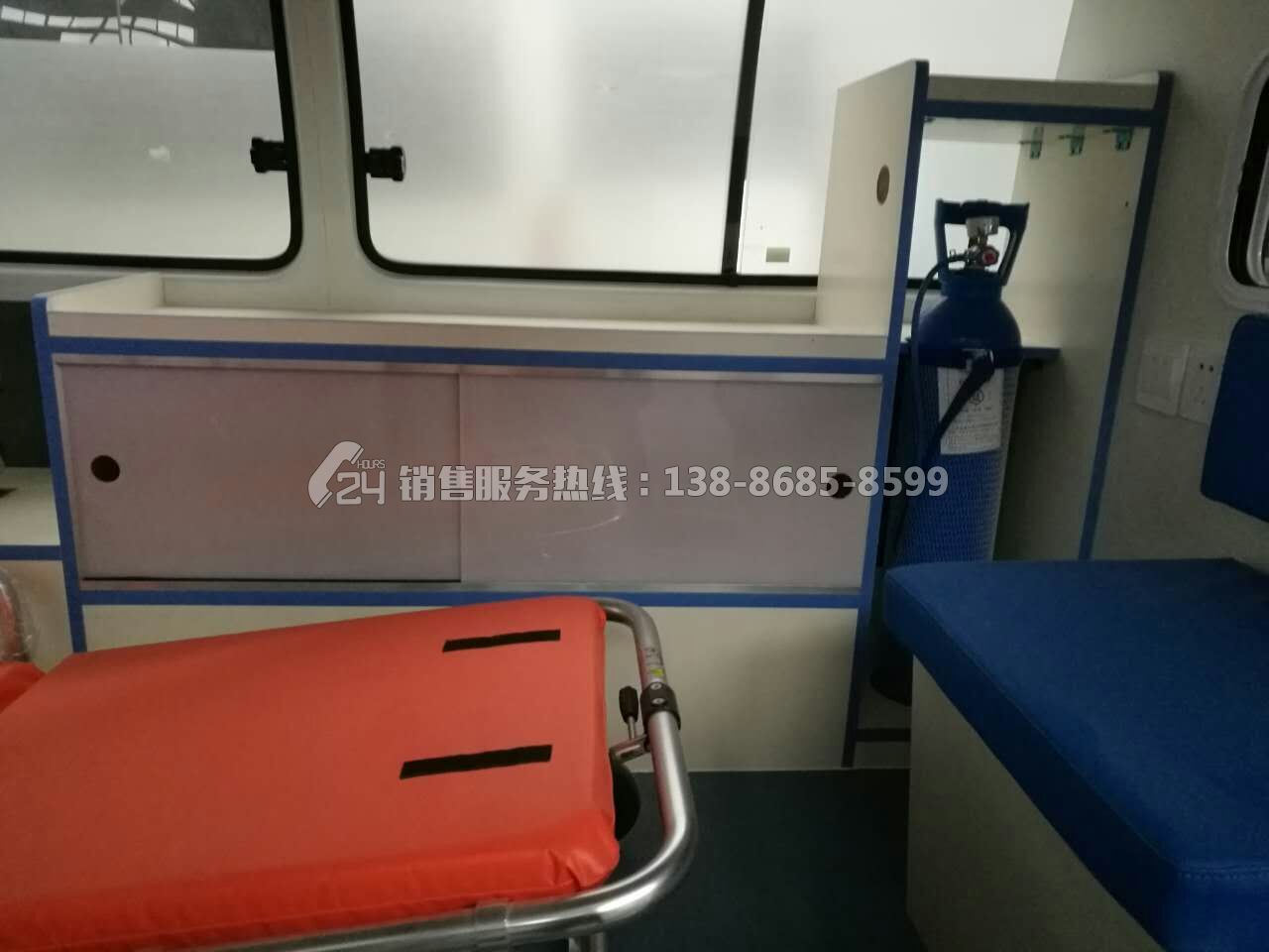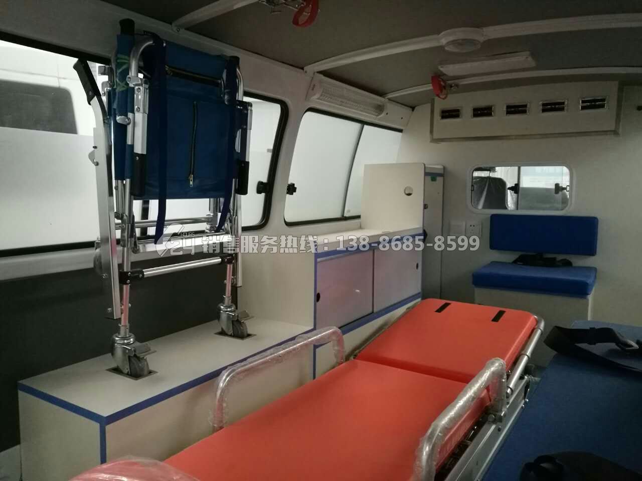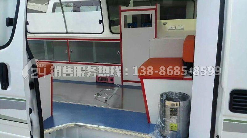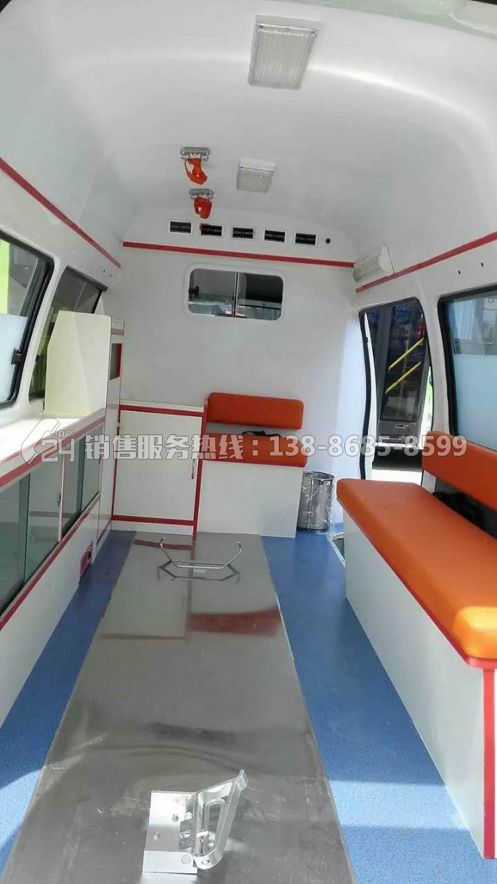 1、便攜折疊式擔架1件;2、醫(yī)藥柜1件;3、固定安裝氧氣瓶1只;4、輸液吊鉤2只;5、消毒燈1只;6、污物桶1只;7、單人座椅3只;8、長條貯藏柜帶2人位軟座墊、軟靠背和安全帶1套;9、中隔斷帶鋁合金滑窗1套;10、前頂裝全藍警燈警報器1套;11、照明燈2只;12、逆變器1只;13、電源插座1組;14、中門上車扶手;15、后門上車踏板;16、醫(yī)用耐磨塑膠地板革;17、貼救護十字標志;