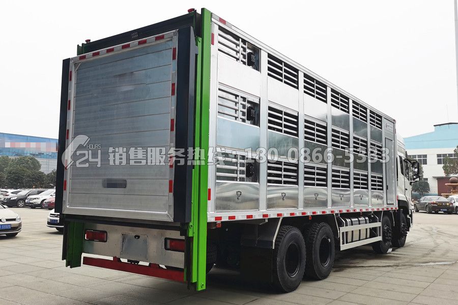 2、實際使用面積:車廂總長9.6米,前部分留有80公分左右的操作間,可使用面積為 每層約21個方,三層共約63個方,每層層高約85公分,8KG左右的小豬苗(需加層到四層)可裝約1200頭每層63公分高,不加層可拉850頭左右,125KG左右的肥豬約110頭左右。