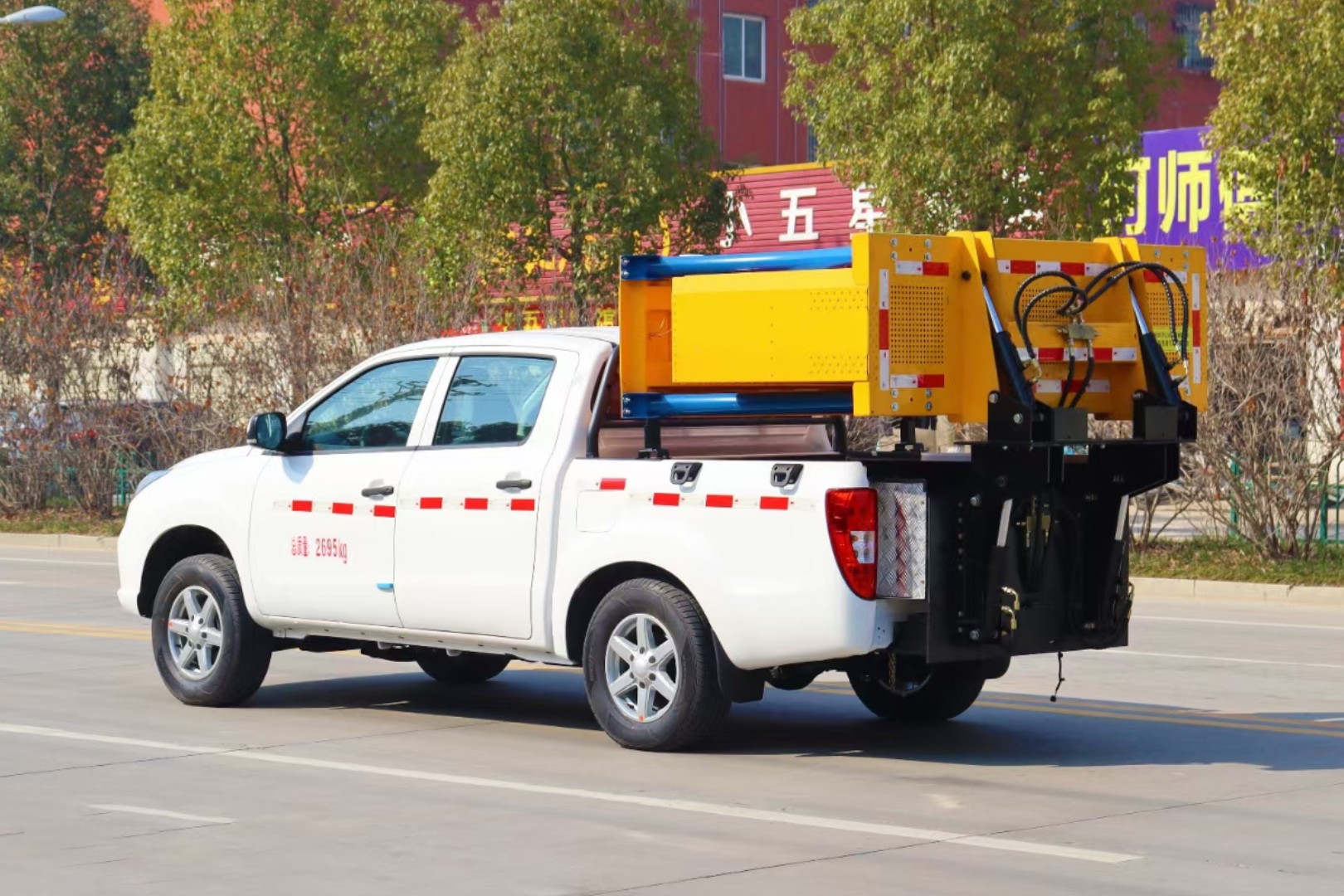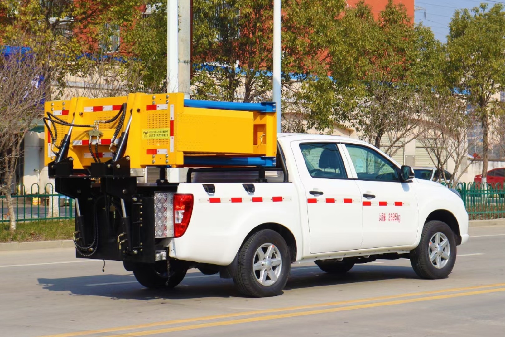 上裝采用Q235國標邊3mm底板花紋板4mm厚,箱體后部防撞緩沖模塊包采用國際知名技術產(chǎn)品70K防撞緩沖模塊,防撞緩沖吸能模塊主要由車載防撞緩沖墊和導向標志架組成,可充當施工作業(yè)車輛后方的緩沖衛(wèi)士。