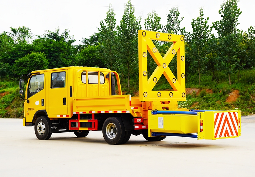 上裝貨箱采用Q235國標優(yōu)質(zhì)碳鋼板,箱體后部防撞緩沖模塊包采用國際知名技術(shù)產(chǎn)品70K防撞緩沖模塊,防撞緩沖裝置主要由車載防撞緩沖墊和導(dǎo)向標志架組成,充當施工作業(yè)車輛后方的緩沖衛(wèi)士。 如若發(fā)生追尾事故,能夠在肇事車輛和前方施工作業(yè)區(qū)域之間構(gòu)建一個緩沖區(qū)域,通過機具結(jié)構(gòu)變形吸收撞擊的能量,最大限度地降低被保護人員及設(shè)備遭到碰撞的幾率。高性能液壓系統(tǒng),可實現(xiàn)快速舉升和落下操作。高清LED顯示屏可由手機APP控制,可隨時切換顯示內(nèi)容,一鍵操作方便快捷。