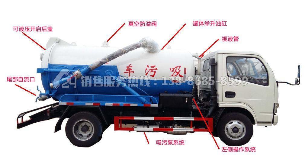 吸污車專用部分由壓力罐體(采用國標(biāo)6mm厚碳鋼板、可選擇使用不銹鋼罐 、襯塑罐)、真空吸污泵、取力器、傳動軸、水氣分離器、油氣分離器、多路換向閥、放污閥、視污窗、真空壓力表、管網(wǎng)系統(tǒng)、液壓系統(tǒng)、洗手裝置等組成,隨車配置大功率真空吸污泵和優(yōu)質(zhì)液壓系統(tǒng),罐體封頭一次壓鑄成型、罐體可液壓后開、雙頂液壓自卸。罐內(nèi)污物可通過后蓋直接傾倒,具有真空度高(比吸糞車的吸力更大)、噸位大、效率高、用途更廣泛的特點(diǎn)。