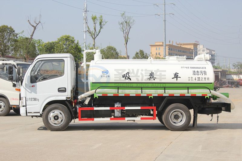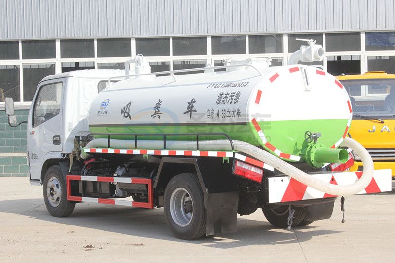 東風(fēng)多利卡5噸吸糞車罐體形狀為橢圓形,采用武鋼6mm厚優(yōu)質(zhì)碳鋼鋼板,罐體帶視糞窗,洗手裝置,舉升裝置,吸污管5米一根,罐體多種顏色選擇,其余按廠內(nèi)標(biāo)準(zhǔn)配置制作。隨車配置大功率真空泵和優(yōu)質(zhì)液壓系統(tǒng),罐體封頭一次壓鑄成型、罐體可后開、雙頂自卸。罐內(nèi)污物可通過后蓋直接傾倒,具有真空度高、噸位大、效率高、用途更廣泛的特點(diǎn)。(垂直吸程:≥7 m,工作壓力:7000Pa,理論抽速:110L/S,進(jìn)排氣口徑:50mm,抽滿罐時間:<5 min,排滿罐時間:<4min。吸糞車采用大功率真空泵,一次壓鑄成型的封頭-,加厚的抗壓罐體,雙頂液壓系統(tǒng),。